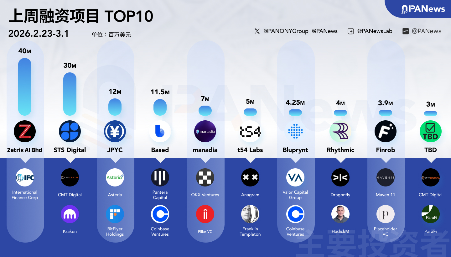 据 PANews 不完全统计,上周(2.23-3.1)全球区块链有15起投融资事件,资金总规模超1.29亿美元,概览如下概览如下: