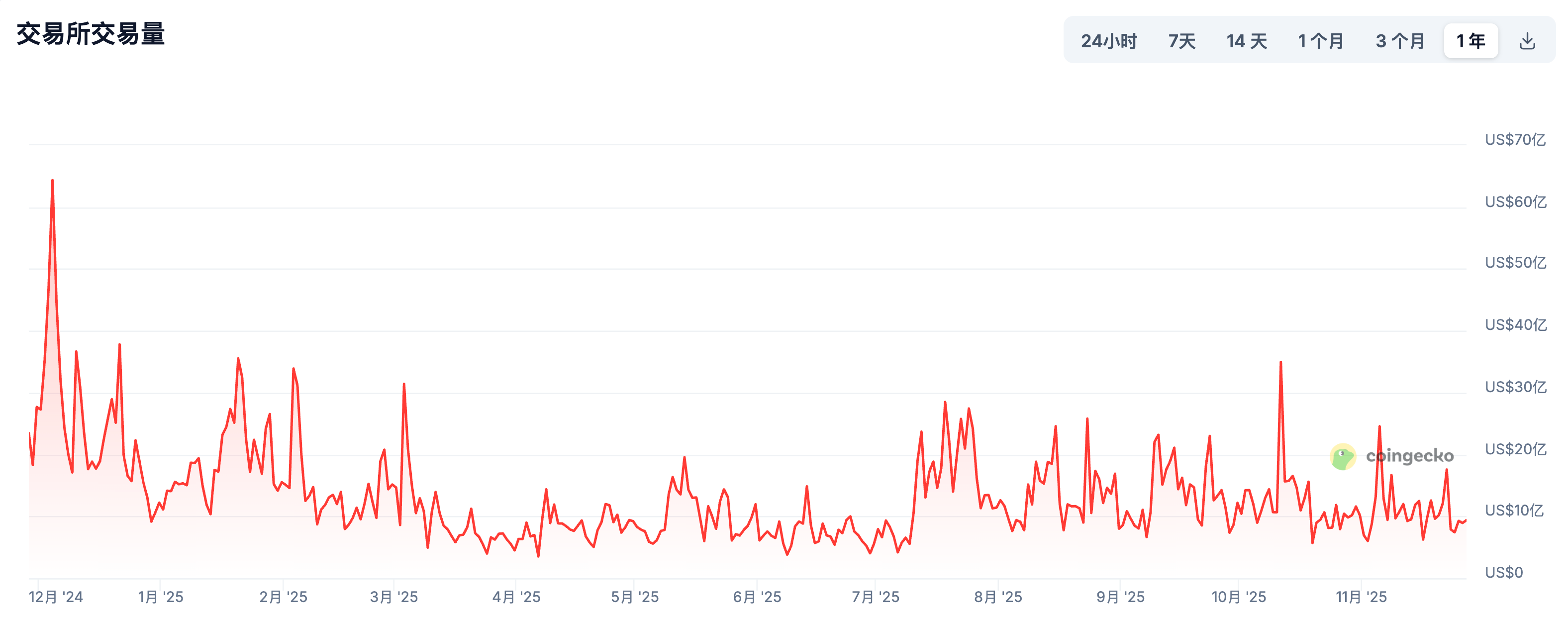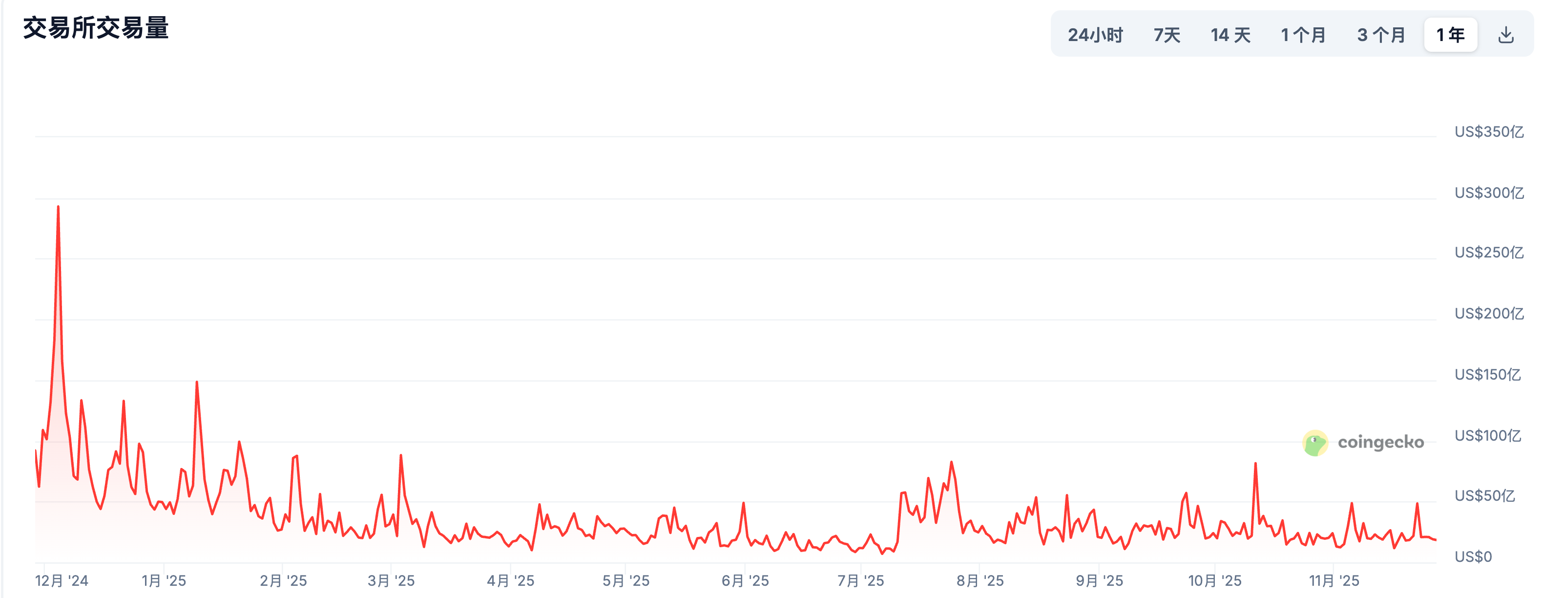 更值得关注的是整体市场热度的变化——交易量指标较去年大幅下滑。2024年底韩国加密市场曾出现一波疯狂行情:据统计,2024年12月3日Upbit单日成交额飙升至274.5亿美元,创下历史峰值,约为平日水平的十倍。然而,这一“疯狂之夜”过后,市场情绪急转直下,2025年进入降温通道。2025年11月Upbit日均交易额仅约17.8亿美元,较2024年末的高点暴跌了80%。其交易量已连续四个月下降,并趋于在20亿~40亿美元区间窄幅波动。