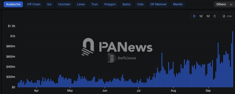 进入第三季度,Avalanche 链上交易和 DeFi 活动进一步走高。2025年9月上旬,Avalanche 上去中心化交易所的单日成交量接近 9 亿美元,创下自3月以来的新高,在所有区块链网络中排名第六。据DeFiLlama 数据,在9月24日,Avalanche DEX 日交易量还一度冲到了11.7亿美元。