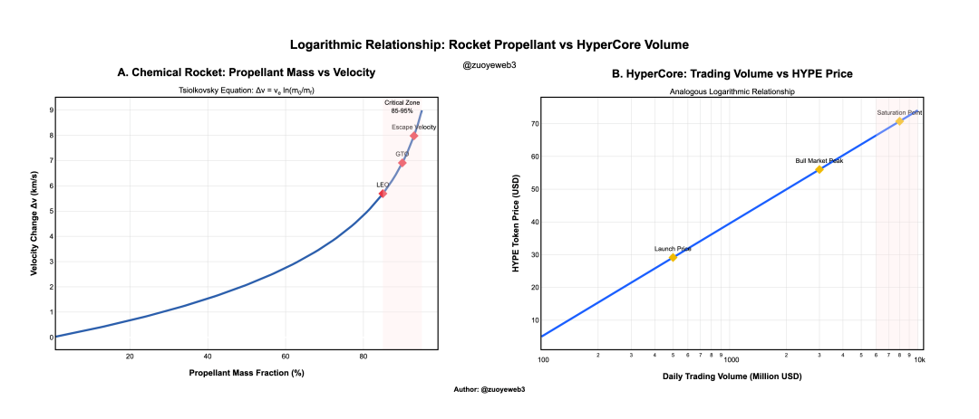 火箭燃料和推力的关系是对数关系,HyperCore 交易量和 HYPE 币价也是对数关系。
