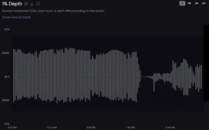 北京时间5:00:关键转折点。美国市场开盘之际,宏观环境急剧恶化。机构参与者撤出流动性,买卖价差大幅扩大,订单簿深度骤减。做市商正是在此时从防御性头寸调整转为全面撤离。