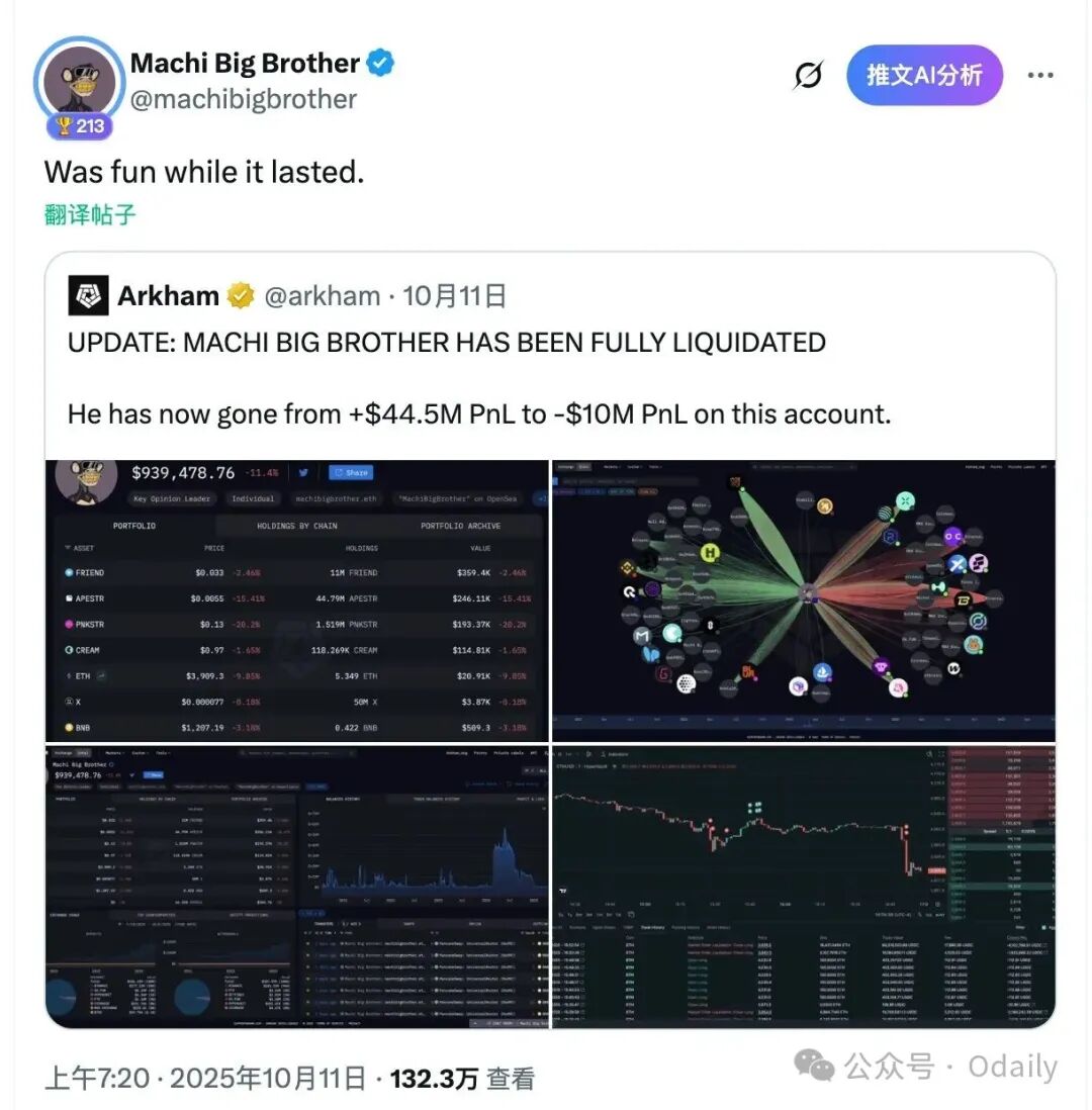 这场循环在十月重复了不下十次。像一个输红眼的赌徒,不断“补仓”,但每一次补仓都被更猛烈的下跌无情吞噬。10 月 11 日、10 月 14 日、10 月 23 日、10 月 30 日……他的仓位被一次又一次地清算。尽管期间市场偶有反弹,让他小额仓位出现近百万美元浮盈,但相较于巨大的亏空,这只是杯水车薪。到 10 月 31 日,他的总亏损已达1450 万美元。