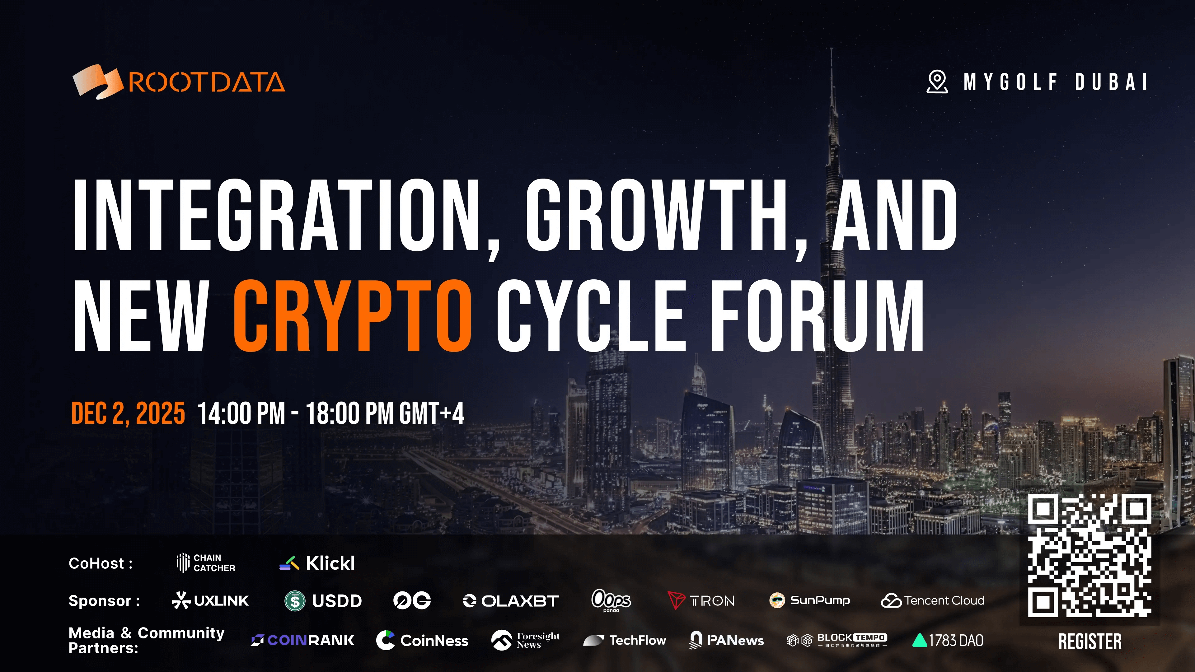由 RootData 联合 ChainCatcher 与 Klickl 共同举办的「融合、增长与新加密周期」主题论坛,现已进入最后 5 天倒计时。本次论坛获得了 UXLINK、USDD、0G、Olaxbt、Oops Panda、Tron、Sunpump、Tencent Cloud 等联合赞助支持,定于12月2日 14:00-18:00(GMT+4)在迪拜举行。