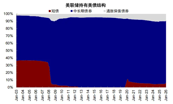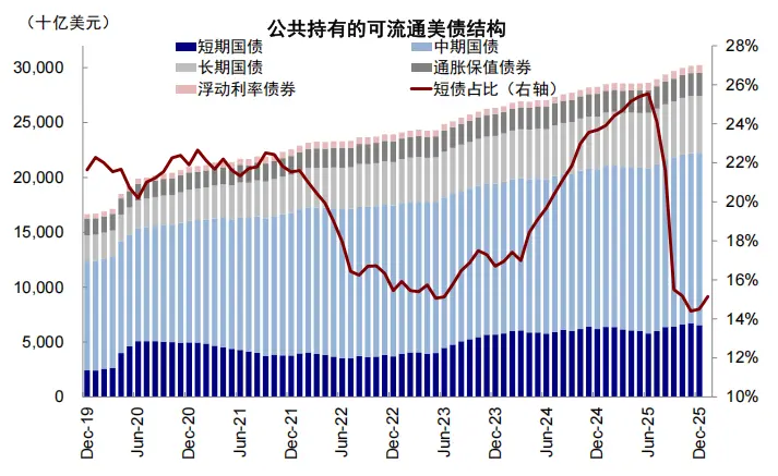 ► 持有结构“内生化”:外国投资者持有美债比例的变化反映了全球对美债作为安全资产的需求强度,这一指标自2014年34%的高位持续回落至2022年的23%后小幅抬升至当前的25%。这种从全球储备资产向普通主权债务模式的转变,意味着美债此前享有的“额外信用需求”在减弱。