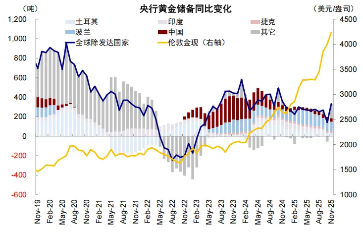 细看全球主要国家在黄金和美债的持有动机也有很大不同。我们以黄金占官方外储的比例超过15%(全球中位数)、美债持有量占外储的比例(由于TIC数据包含外国官方及私人部门总持仓,部分国家美债占比可能超过 100%)来构建象限,具体来看:1)高美债+低黄金:包括加拿大、挪威、英国、澳大利亚、日本、新加坡等仍处于美元体系并追求需要流动性的外向型经济体,持有高比例美债可以满足频繁的跨国贸易结算需求,同时也能在汇率波动时提供弹药。其中,加拿大和挪威在官方外汇储备中完全不持有黄金,但持有美债的规模相当于其外储规模的372%和242%。2)低美债+高黄金:这其中既包括拥有深厚黄金储备历史的德国和意大利,也包括对抗高通胀和本币信用危机而大幅增持黄金的土耳其,以及为了安全战略而主动“去美元”的俄罗斯和波兰。3)低美债+低黄金:以中国、印度、韩国、巴西、墨西哥等为代表的多元配置派,既不盲目依赖美元,也不过度囤积黄金;4)高美债+高黄金:荷兰和法国呈现“双保险”机制,在持有高比例的美债同时,依然保留规模显著的黄金储备。对比黄金大涨前的2023年,挪威、加拿大、新加坡和韩国配置美债的规模显著增加,而土耳其、俄罗斯、意大利、波兰、德国和中国等配置黄金的比例明显抬升。