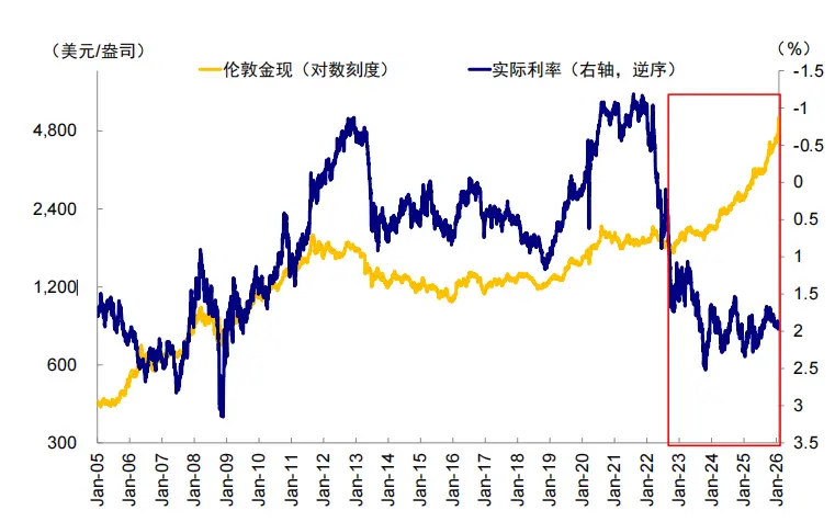 ► 是因为实际利率走低吗?不是。实际利率是黄金传统定价框架的关键,可看作持有黄金的机会成本,也是黄金抗通胀属性的体现。然而,实际利率从2022年9月的1%最高升至2023年10月的2.5%,黄金却逆势上行。远的不说,2025年11月以来金价上行斜率再度变陡,但在美国降息预期摇摆的情况下,实际利率整体从1.7%走高至1.97%,也无法解释这波金价上涨。