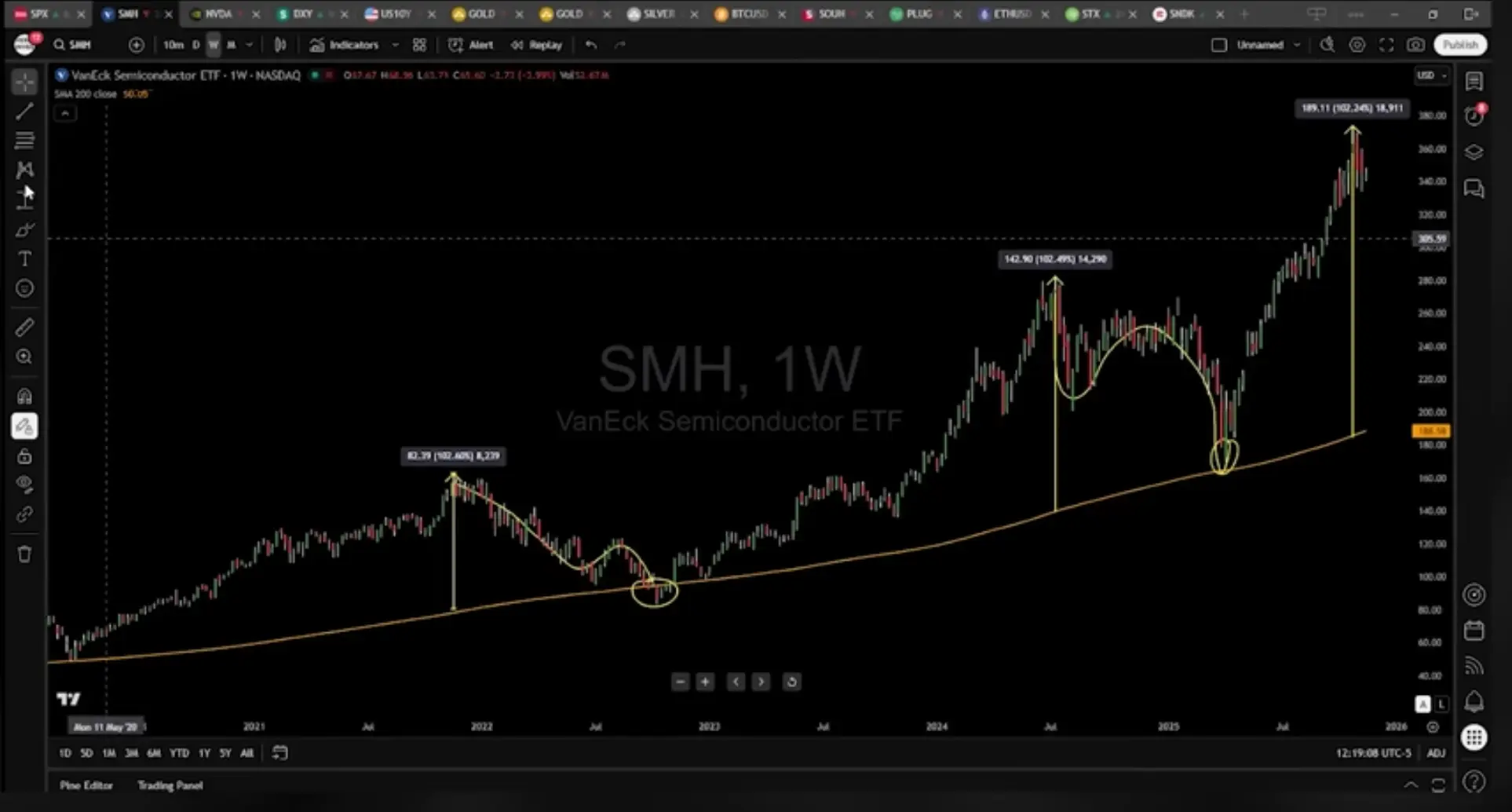 看SMH(VanEck半导体ETF)的周线图,它基本上涵盖了博通(Broadcom)、英伟达、AMD等所有主要半导体公司,黄色的线是200周移动平均线。回溯到2020、2021年,我们看到相对周线200周均线的偏离有个规律:过去在高点时,曾离200周均线高达102%,随后出现45%的大幅回调。