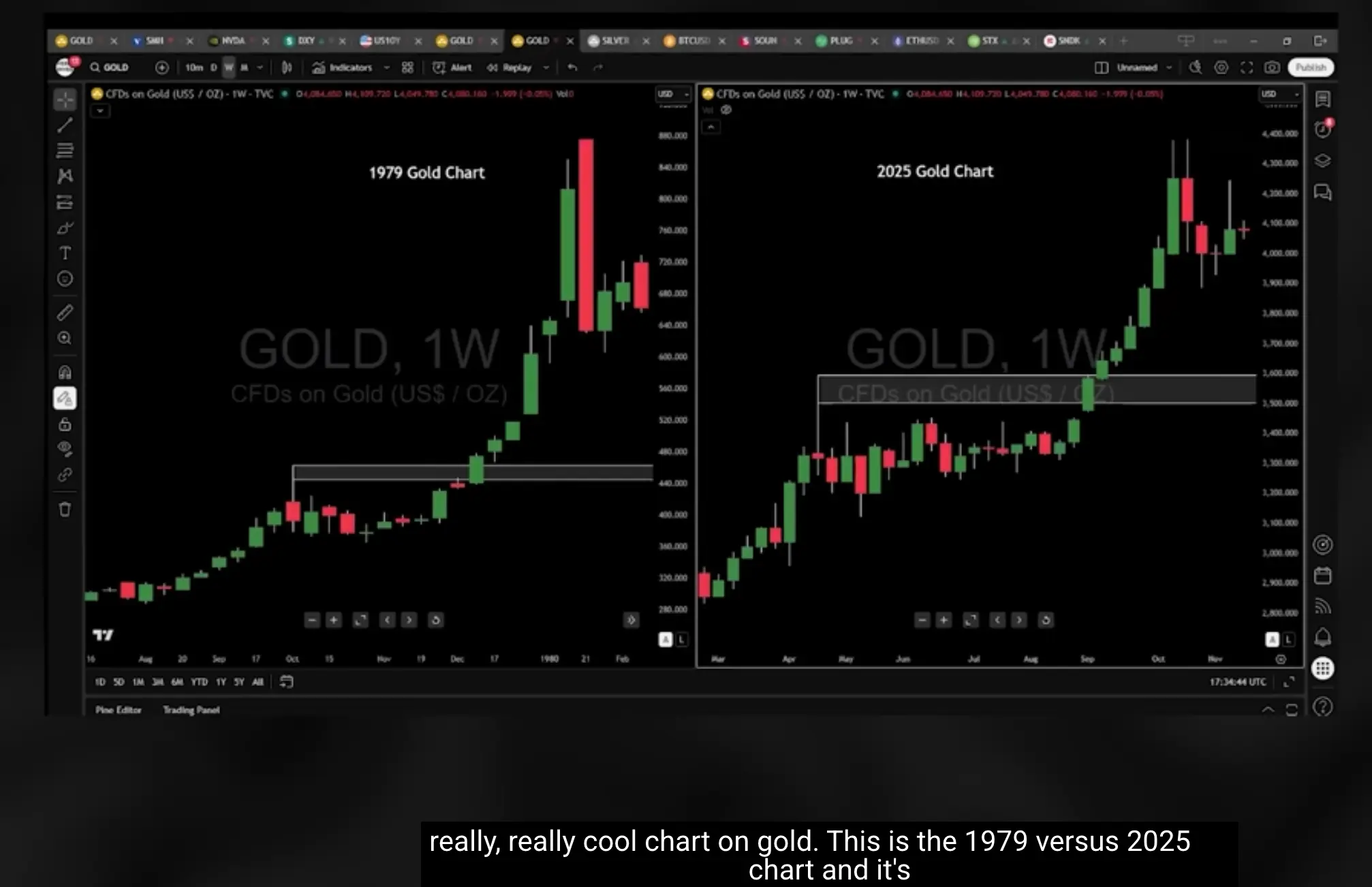 Gareth:我个人认为黄金还有一点下行空间,因为还没把“弱手”洗出来。市场通常在开启下一轮牛市之前,倾向于先清洗掉这些不坚定的持有者。把 1979 年金价走势与 2025 年对比几乎呈现相似的模式:先是一波上涨,然后横盘整理,再连续多周上涨(1979 年有 9 周连续周线阳线,2025 年也出现过 9 周)。历史上 1979 年那波整理回撤到关键支撑位后才展开新一轮上涨。
