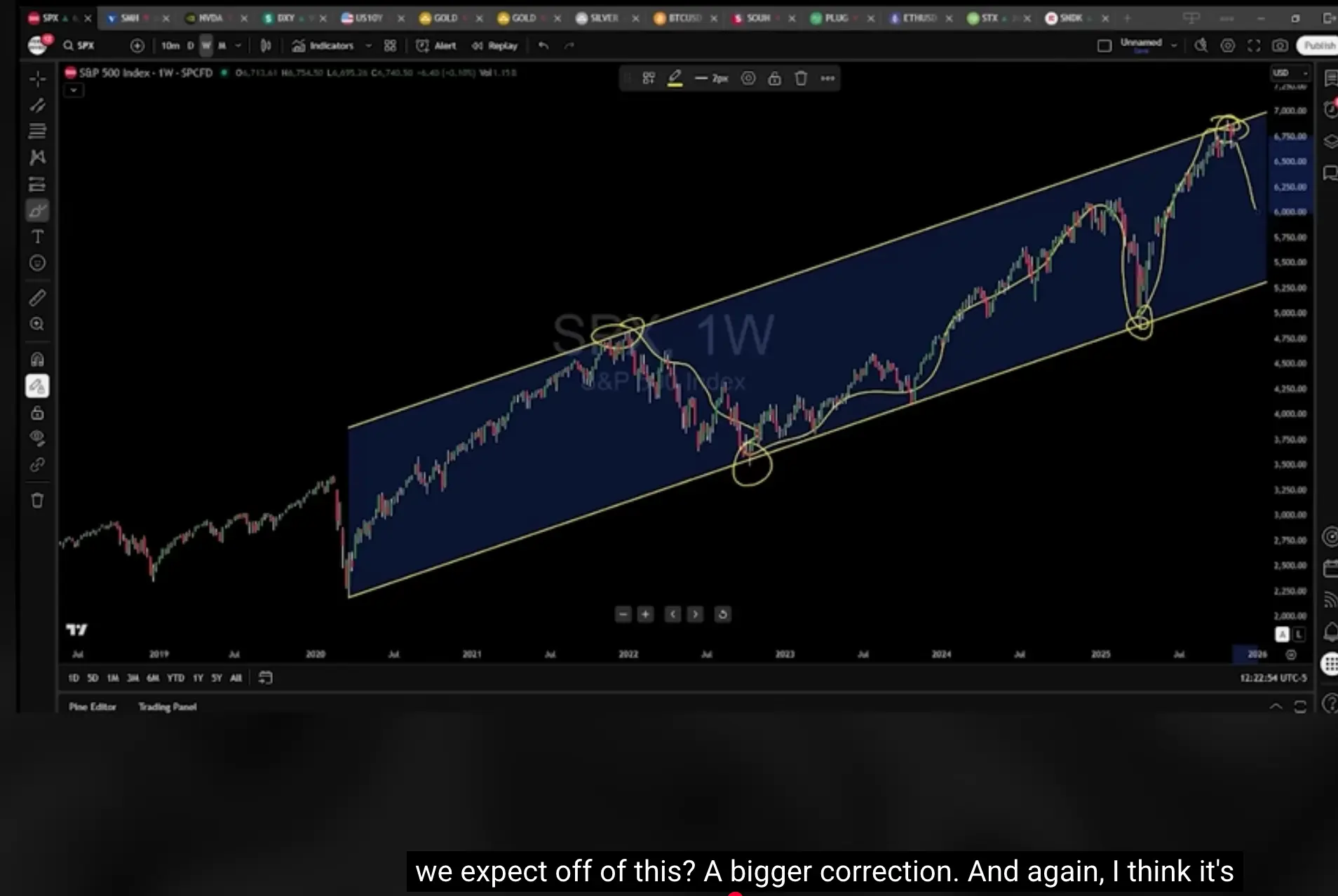 让我给你看这张标准普尔500指数的图表,我将向你展示为什么我们很可能已经达到了一个顶部。从2020年新冠疫情低点到2022年熊市低点形成了一条明显的趋势线,而目前标普500指数已触及与2021年牛市高点平行的上轨线。历史数据显示,当市场触及该通道上轨后,曾出现熊市级别的回调。