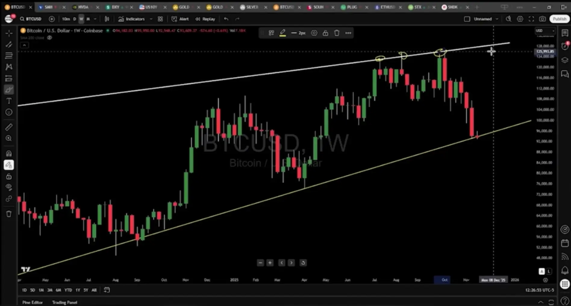 Gareth:专业来看,这次的高点其实很容易判断。我们之前几个月就讨论过,如果你连接2017年牛市高点和2021年第一个高点,这条趋势线完美地预测了最近的每一次顶部。