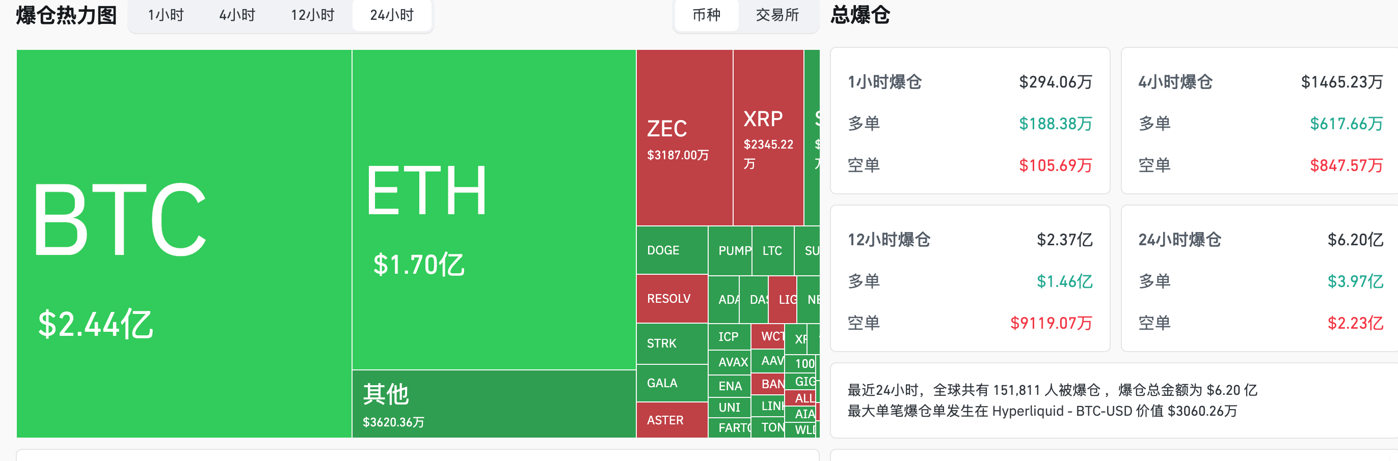 24小时爆仓数据:全球共151811人被爆仓 ,爆仓总金额为6.2亿美元,其BTC爆仓2.44亿美元、ETH爆仓1.7亿美元、ZEC爆仓3187万美元
