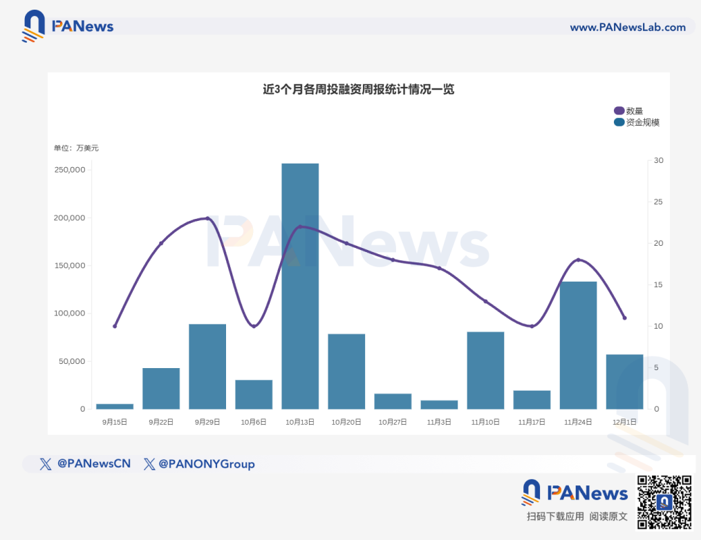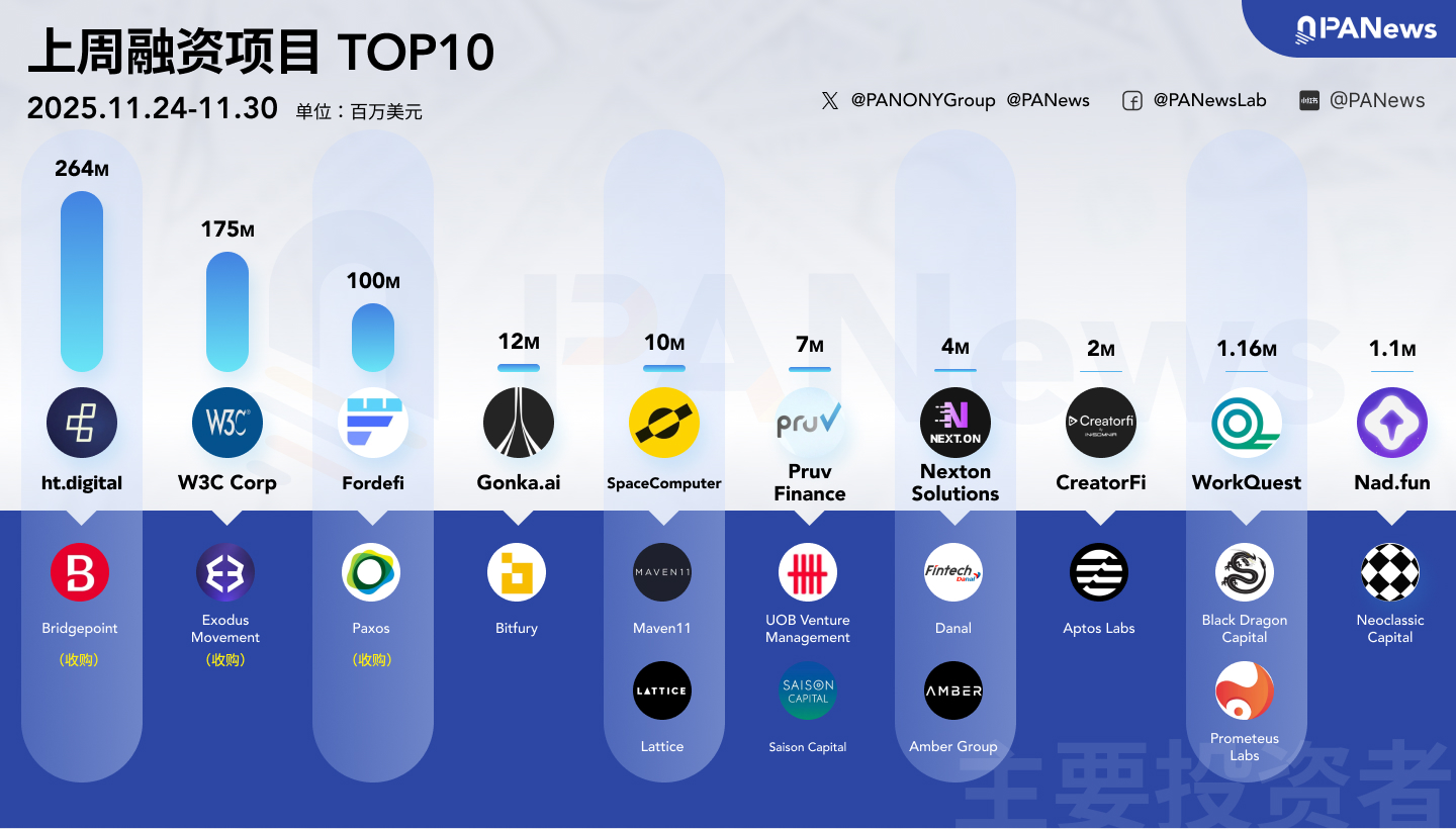 据 PANews 不完全统计,上周(11.24-11.30)全球区块链有11起投融资事件,资金总规模超5.72亿美元;此外,上市公司加密资产储备融资总额超2.35亿美元,概览如下概览如下: