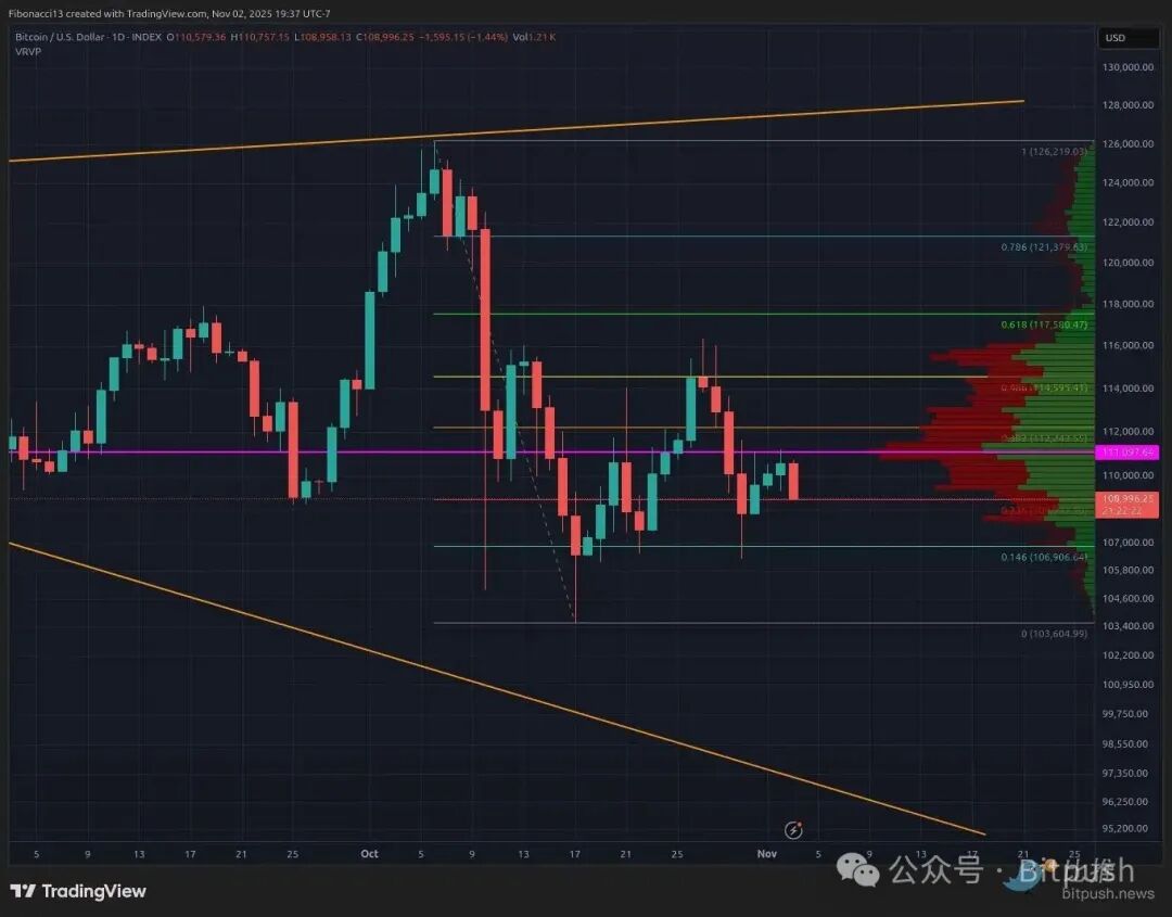 分析师Micah Zimmerman表示,106,900美元支撑位–0.146斐波那契回撤位对齐–在上周被反复测试,最终未能引发有效的买盘介入。目前市场将目光投向104,000美元这一防线,但该位置也已历经两次考验,支撑力度正在减弱。
