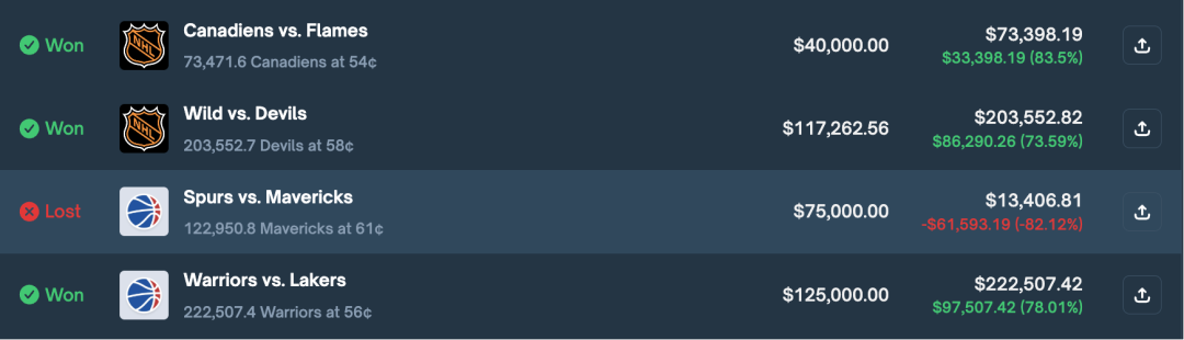 之后的押注事件结果看起来稍显无聊,但其中过程对于 Mayuravarma 称得上是一切顺利。其在 LOL 比赛、NHL 比赛、NBA 比赛中整体保持着较高胜率,而从这些比赛押注界面我们也能看到其另一押注风格:更倾向于押注赛前赢面更高、实力更强的队伍,而非寄希望于爆冷反转。这在一定程度上反映了 Mayuravarma 对各类体育赛事的深度关注和了解,同时也为其持续盈利提供了一定的保障,但也为比赛爆冷留下了一定的隐患。