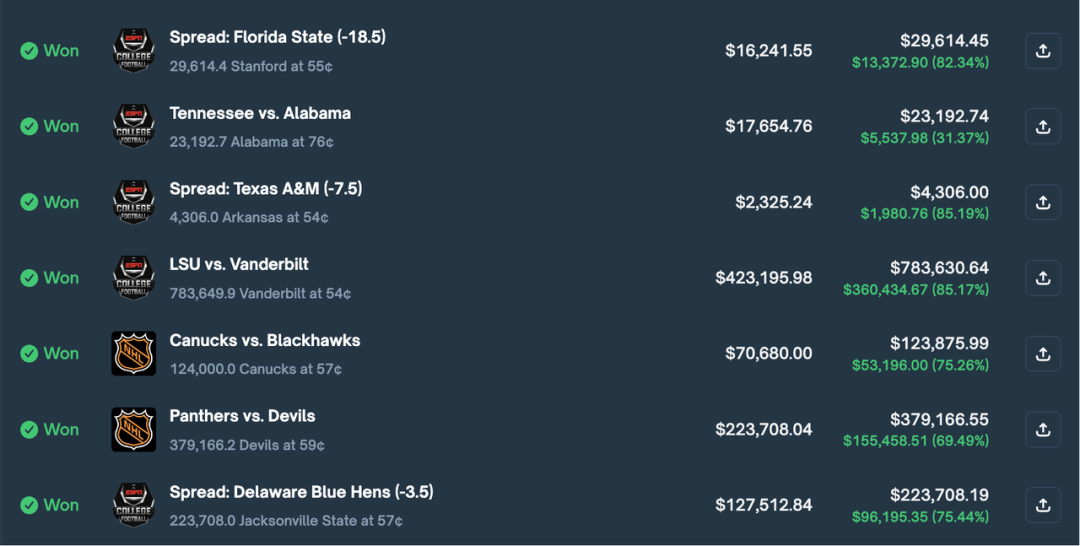 初时,Mayuravarma 押注几乎称得上“逢赌必赢”:在 5 场 CFB 赛事及 2 场 NHL 比赛中,其凭借多次下注,获得了 30%~82% 左右的回报率,最多一次盈利高达 36 万美元。