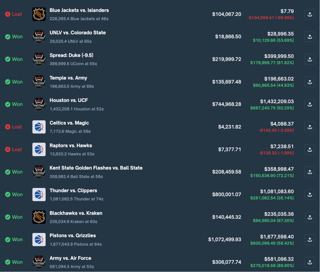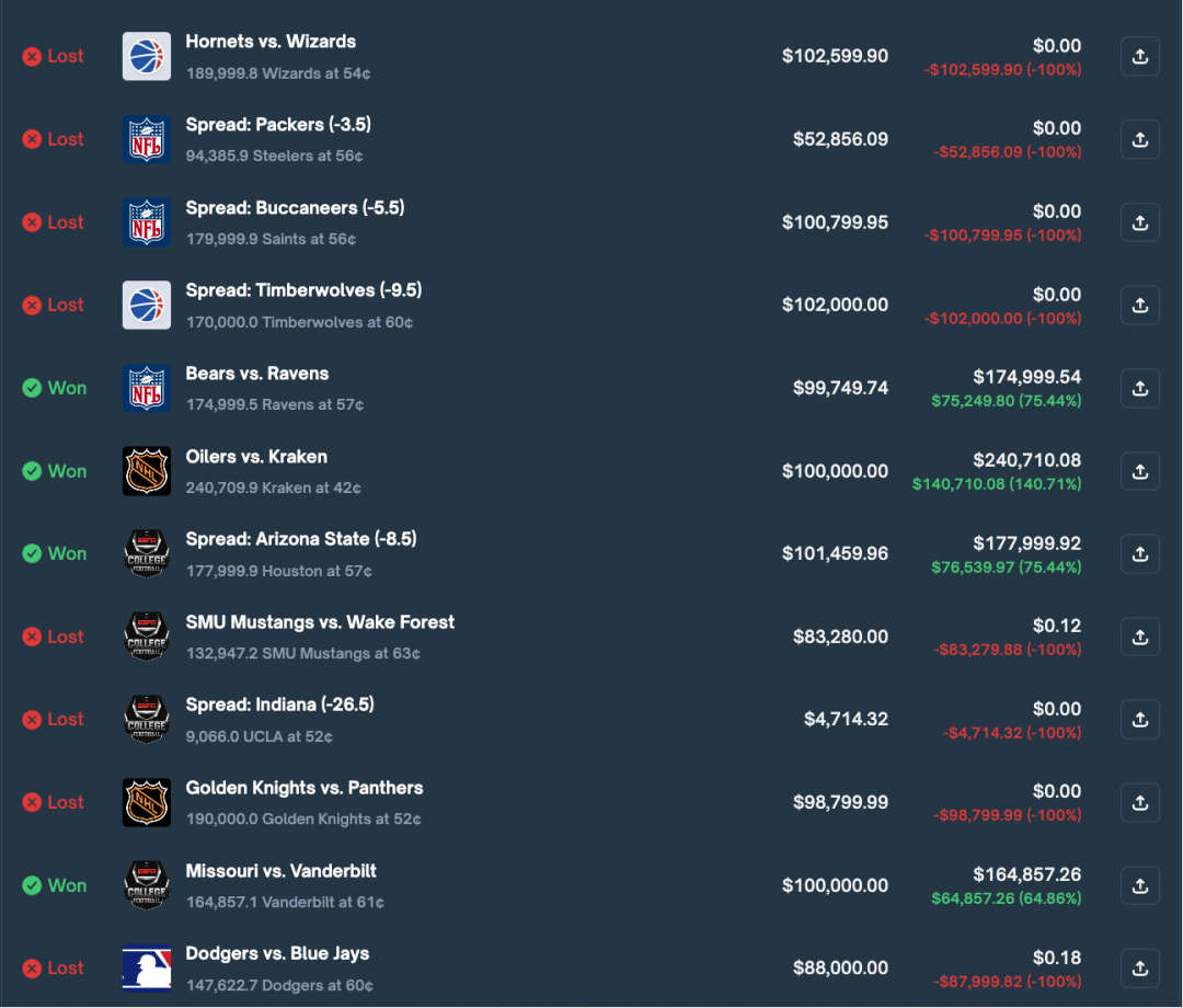 随后,或许是不甘心就此成为 Polymarket 上的一大笑柄,Mayuravarma 再度转入 100 万美元的资金到个人账户,并再次押注各类体育赛事,但最终的结果,仍然是输多赢少。