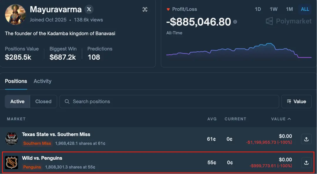 截至撰稿时(11 月 26 日),Polymarket 上 Mayuravarma 的个人账户界面显示,其累计损失在 88.5 万美元,现持有仓位约为 27.85 万美元。这也意味着,其不仅回吐了此前的所有押注利润,自己的本金还损失了数十万美元。