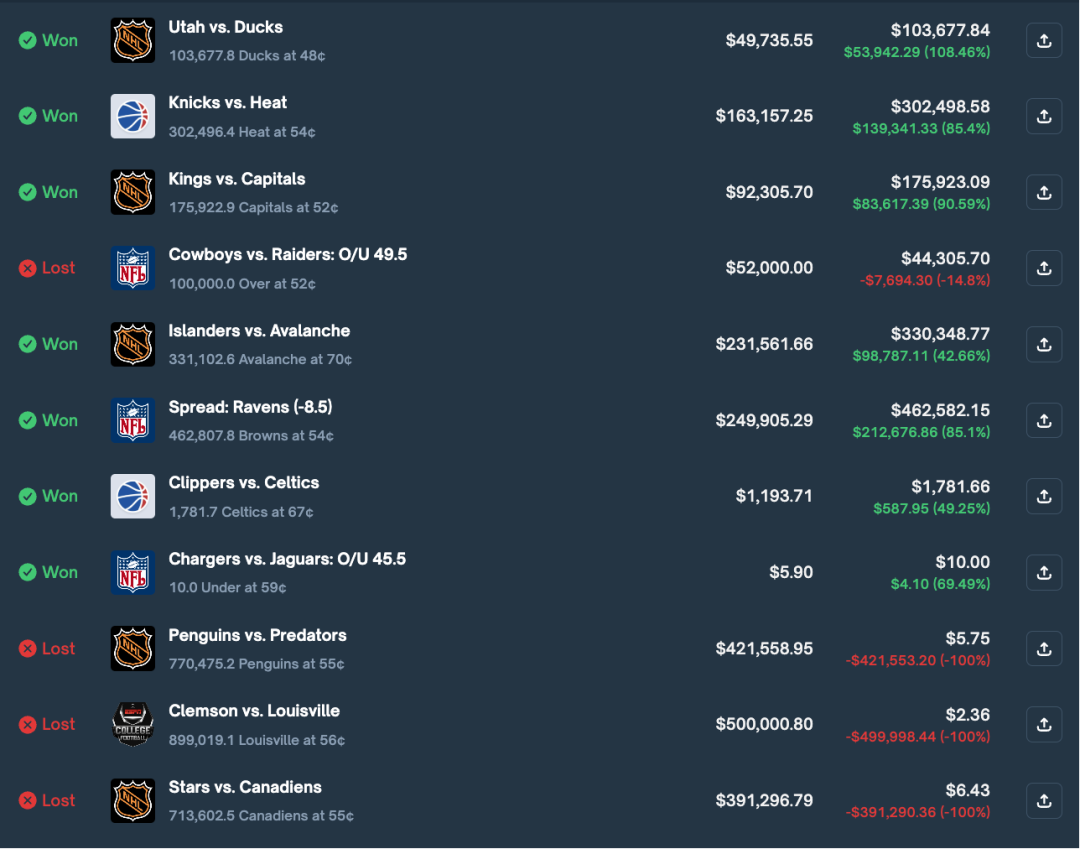这里也能够看出 Mayuravarma 的押注风格:其更倾向于盘前押注,下注金额从数千美元到数十万美元不等,且极少在盘中卖出。这既成为了其能够在早期凭借小资金一步步滚仓赚到大结果的原因,也为后续上头 ALL IN、一把梭哈 NHL 比赛妄图翻盘终遭反噬埋下了伏笔。