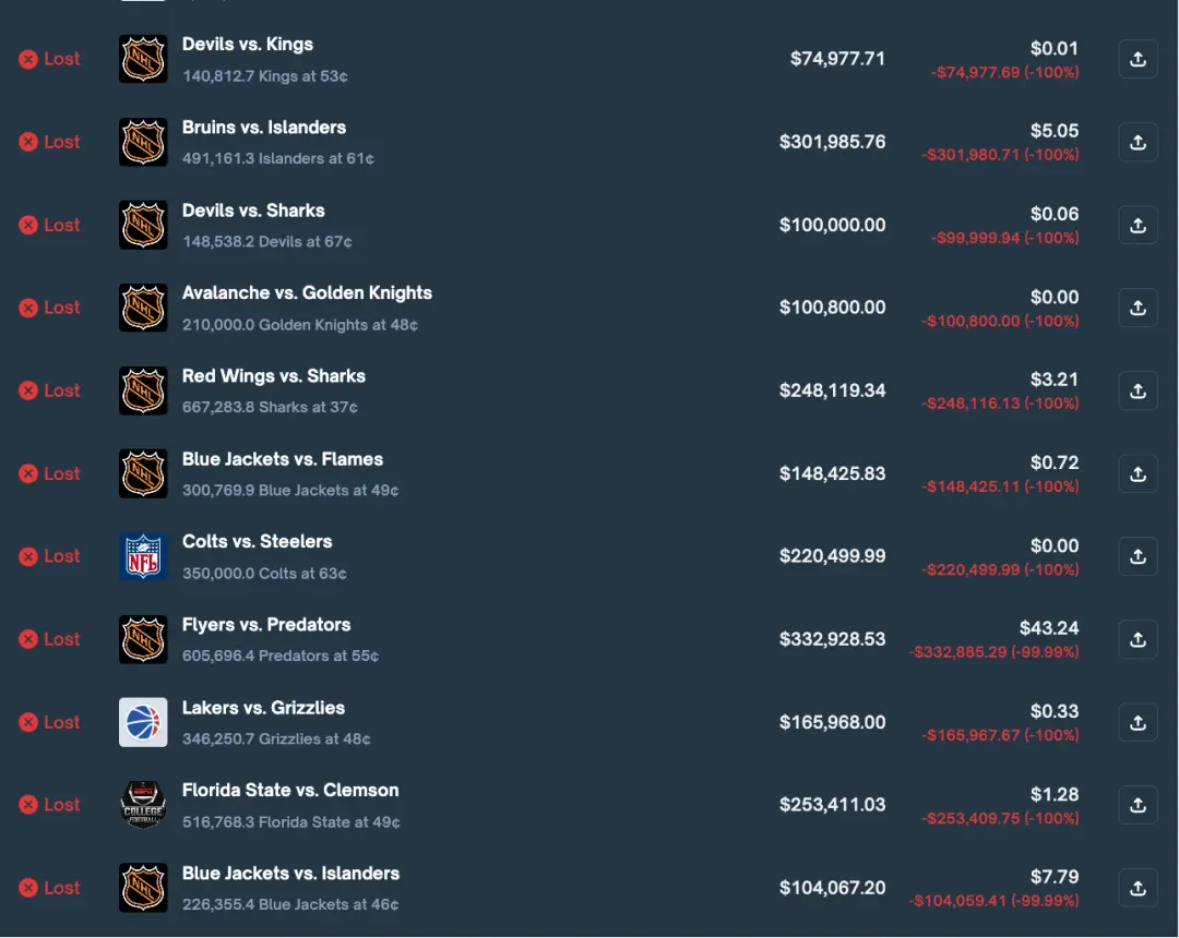 - 在 NHL 比赛 Capitals 对阵 Canadiens 一事中,其再次 ALL IN,投入 120 万美元买入盘前胜率更高的 Canadiens,最终未进行及时止损,近 120 万美元全部亏完,一周之内,其个人盈亏数据表现就已由盈转亏至 -380 万美元。