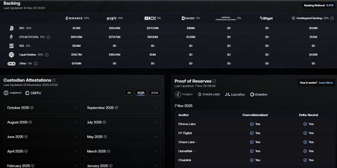 但结果是,USDe 迅速回锚——因为在 Ethena 官网,USDe 兑付正常,储备金仍为 100%。