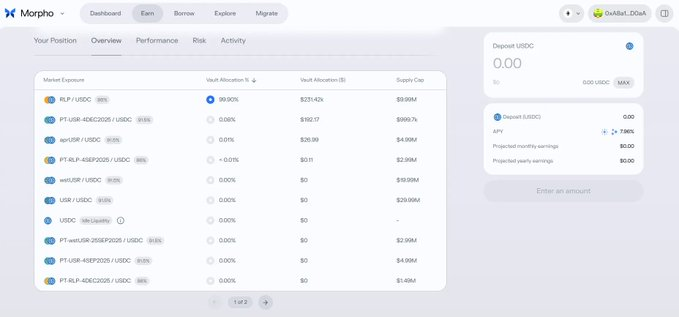 不过,Morpho 在 Earn 页面已标记了 LLTV 数值。在详情页面,也标注了资金分配和管理费收取情况。