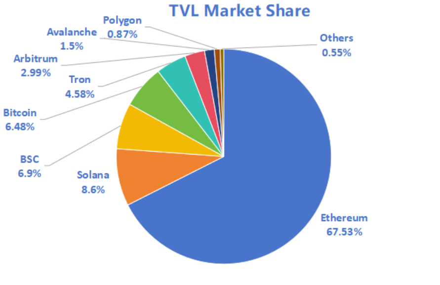 按公链进行划分,其中TVL最高的三条公链分别是Ethereum链占比67.53%;Solana链占比8.6%;BNBChain占比6.9%。