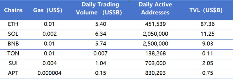 主要从日交易量、日活跃地址、交易费用分析目前主要Layer1含ETH、SOL、BNB、TON、SUI以及APT的相关数据。