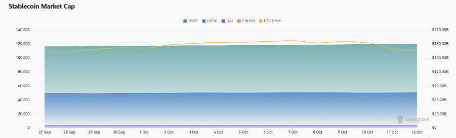 据Coinglass数据,稳定币总市值为3,100亿美元。其中USDT市值为1,794亿美元,占稳定币总市值的57.87%;其次是USDC市值为754亿美元,占稳定币总市值的24.35%;DAI市值为53.6亿美元,占稳定币总市值的1.73%。