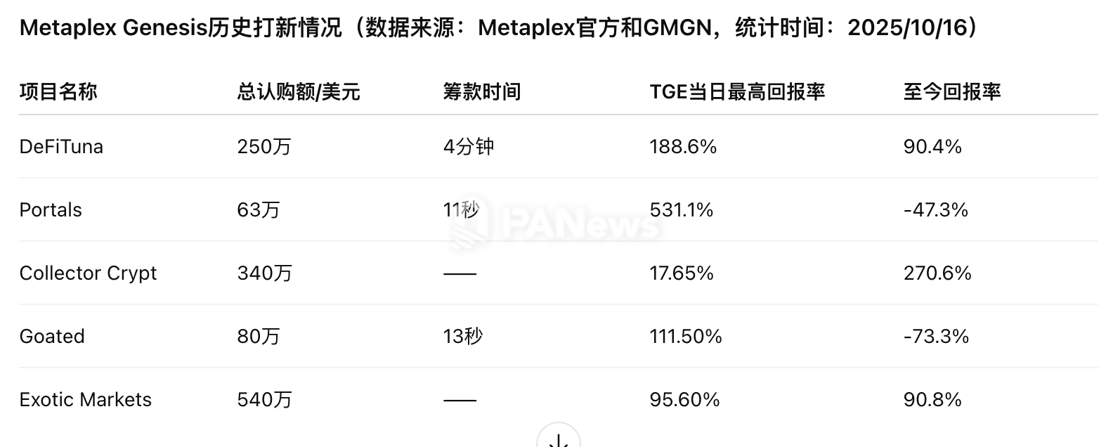 在收益表现方面,TGE当日回报率平均为188.9%,主要受到Portals以531.1%的高回报率的拉动,这不仅为投资者带来可观收益,也显著提升了平台的曝光度。从更长周期来看,至今回报率呈现明显分化,平均水平约为270.6%。Collector Crypt和Exotic Markets分别实现270.6%和90.8%的稳健回报,而Portals和Goated则出现负收益。整体来看,Metaplex Genesis的打新项目的短期市场吸引力强化了其影响力和社区号召力。
