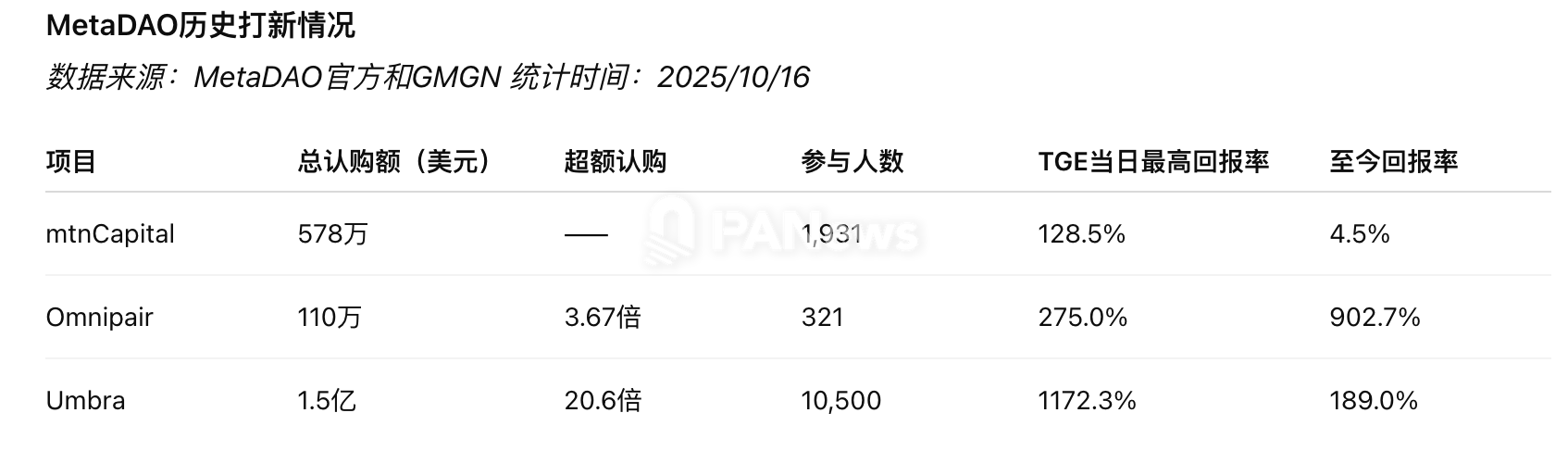 迄今为止,MetaDAO已开展了多轮打新活动,从数据统计来看,这些项目普遍受到市场关注,但不同项目的参与规模差异较大。以参与人数来看,Umbra最高,达到1.05 万人,而Omnipair和mtnCapital分别为321人和1931人。从数据可以看出,MetaDAO在最新项目中用户触达和社区动员能力显著增强,市场覆盖面正逐步扩大。