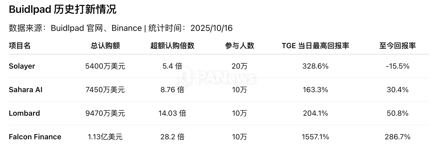迄今为止,Buidlpad 已开启了4个项目的打新,从数据统计来看,这些项目普遍受到市场热捧,参与人数均在10万以上。市场热度也直接推动了项目的认购规模,平均超额认购倍数约14.1倍,特别是Falcon Finance的超额认购倍数高达28.2倍,创下了Buidlpad平台的历史纪录。