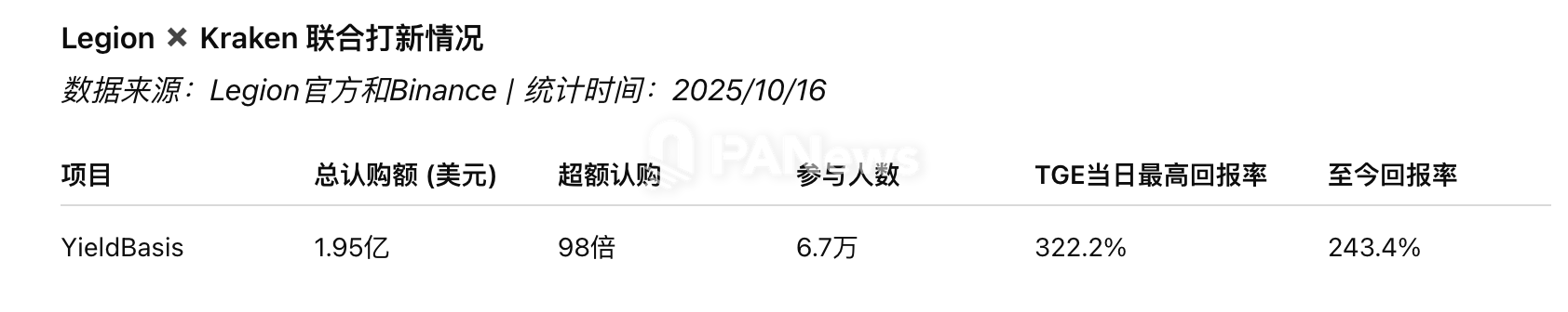 YieldBasis是Legion和Kraken合作的首发项目。在此次发售中,超过6.7万人申请,但最终仅4187人入选,约占申请总人数的7%,这也意味着打新竞争非常激烈。YieldBasis的认购规模超过1.95亿美元,超额认购高达98倍,显示出市场对项目的极高热情和认可度,并创下了Legion平台迄今为止超额认购最多的代币发售记录。