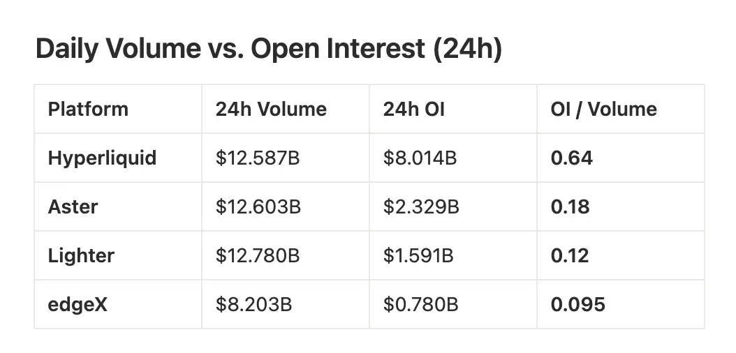 Hyperliquid:高 OI/交易量比率(约 0.64)表明大量交易流转化为活跃的持续持仓。