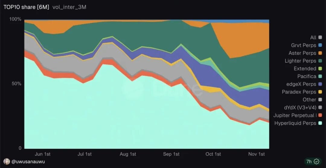 Hyperliquid 占比:约 63% 。这意味着 Hyperliquid 持有主要永续合约交易平台上近三分之二的未平仓合约,总量超过 Aster、Lighter 和 edgeX 的总和。
