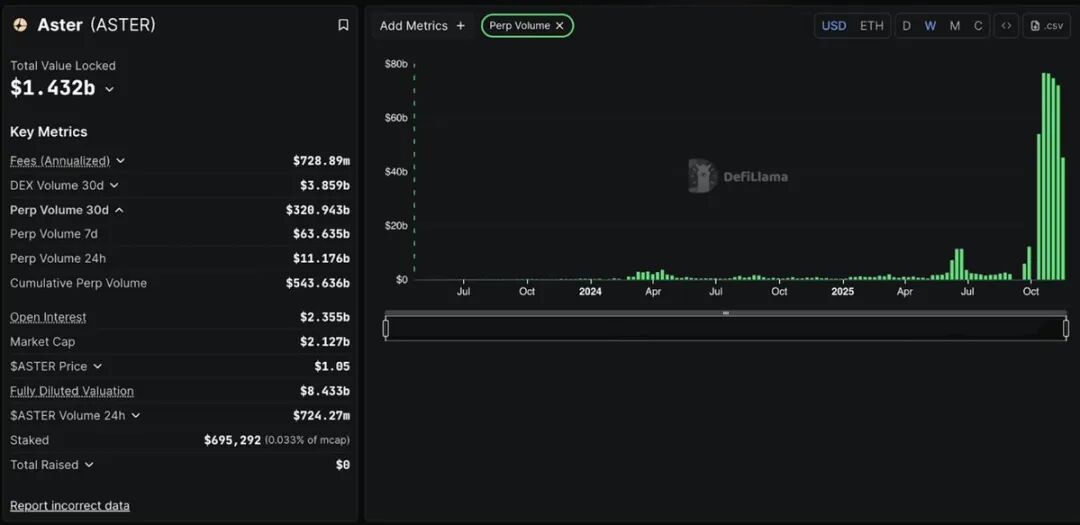 2025 年 10 月 5 日,加密领域最受信赖的数据源 DefiLlama 删除了 Aster 的数据,原因是发现该平台的交易量几乎与 Binance 完全一致——呈 1:1 完美相关。