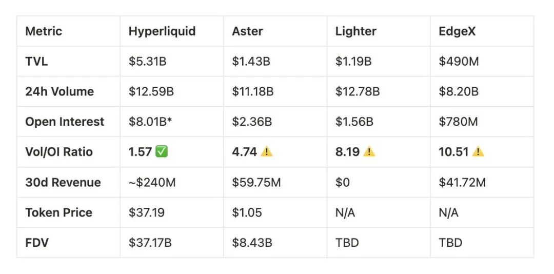 增长策略:各平台针对不同用户群体——Hyperliquid(专业交易者)、Aster(散户/亚洲市场)、Lighter(技术导向)、EdgeX(机构投资者)。