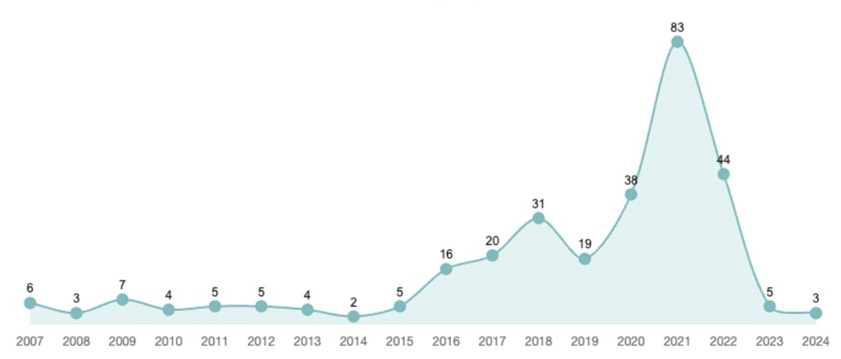 2022 年虽仍有 44 个新账号,但相比峰值明显下降。