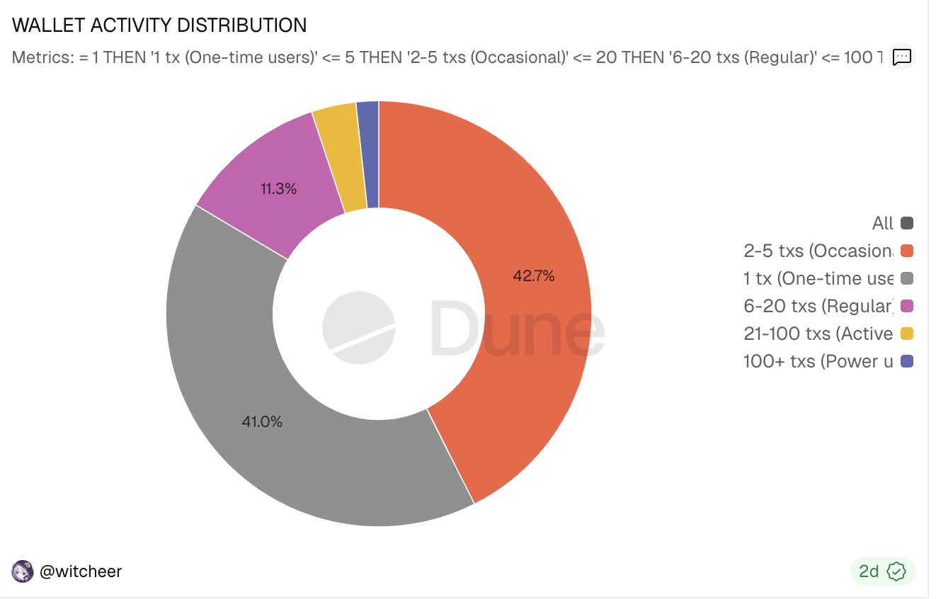 同时,Berachain的用户活跃度也较上线之初出现不小下滑,且缺乏持续的交易动力。Dune数据显示,截至11月23日,Berachain的独立钱包地址数约324万个,日活跃钱包地址维持在数万个,期间出现不小下滑后近期有所回升。从交易笔数分布来看,低于5笔交易的地址占比高达83.7%,而超过100笔的地址仅占1.6%,意味着大部分用户属于低频参与者。同时,其累计交易笔数已接近近2.89亿笔,其中2月上线初期交易量达到单日约200万笔的峰值,但随后交易量逐渐波动下降,尤其到9月下降至20万笔左右,近期已有回升迹象。