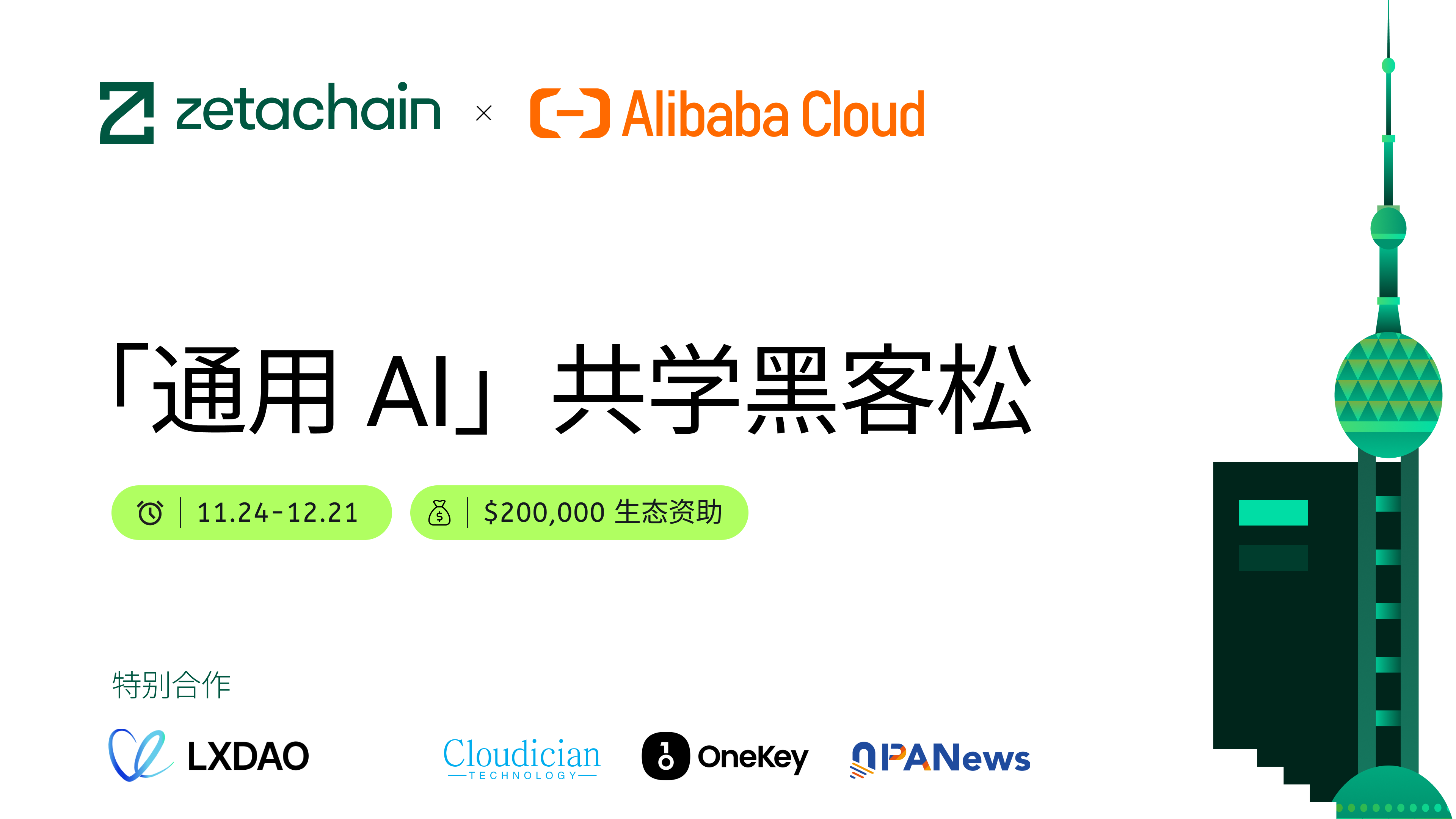 ZetaChain 与阿里云共同发起「通用 AI」共学黑客松:一场融合 AI 与通用区块链创新的共学与开发计划。该计划面向亚太地区开发者开放,总计提供高达 $200,000 的生态资助。本次活动由 LXDAO 联合主办,并负责共学营的整体策划与组织执行。