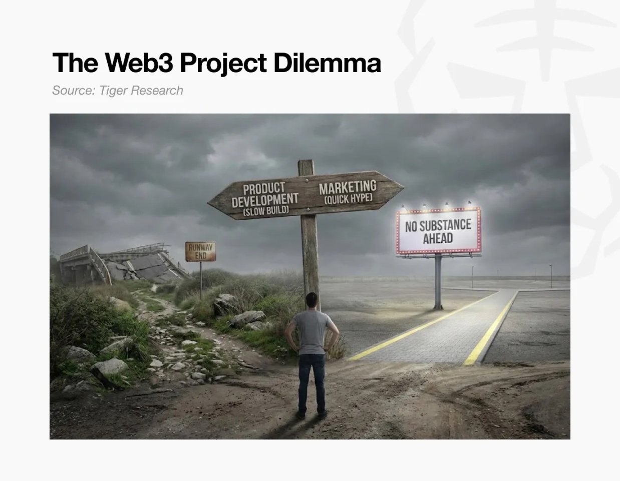 这场危机在很大程度上早已注定。大多数 Web3 项目仅凭「愿景」便完成上市(代币发行),却连实际产品都未落地。这与传统企业形成鲜明对比 —— 传统企业在首次公开募股(IPO)前,必须先证明自身的增长潜力;而在 Web3 领域,团队反而要在上市(代币生成事件 TGE)后,才去证明其高估值的合理性。