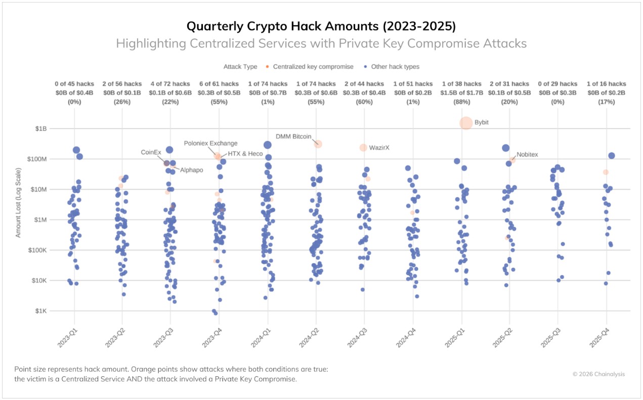 今年创纪录的损失来自已知事件的大幅减少。这种转变(事件减少但损失大幅增加)反映了 2025 年 2 月 Bybit 大规模黑客攻击事件的影响。