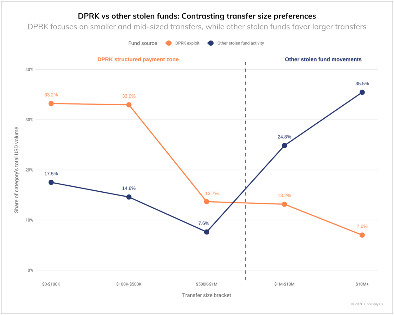 这些模式表明,朝鲜的运作受到不同于非国家支持网络犯罪分子的约束和目标的影响。他们大量使用专业的中文洗钱服务和场外(OTC)交易商,这表明朝鲜黑客与亚太地区的非法行为者紧密联系。