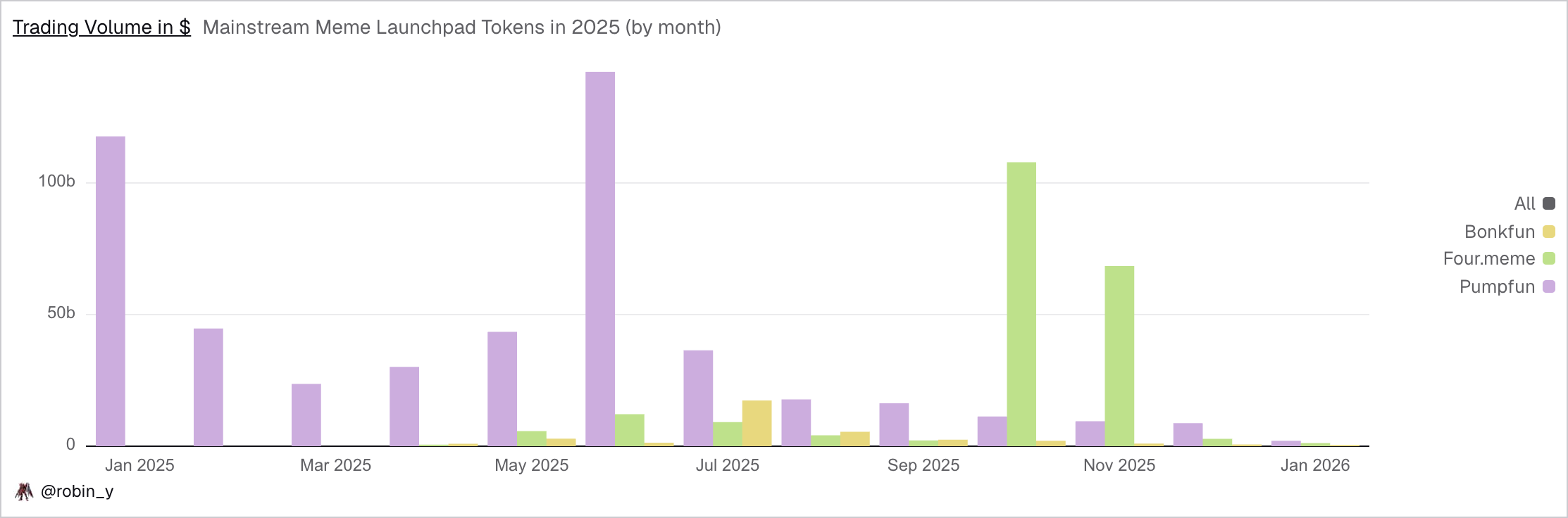 但从主要 Meme Launchpad 的交易量与交易地址数数据来看,Meme 热点的反复出现,并未同步带来链上整体流动性的持续修复,类似 2025 年初特朗普币那种覆盖全市场的 Meme season 正在变得越来越难以复制,2026 年 Meme 更可能呈现结构性行情:围绕特定热点、特定叙事窗口出现阶段性炒作机会。