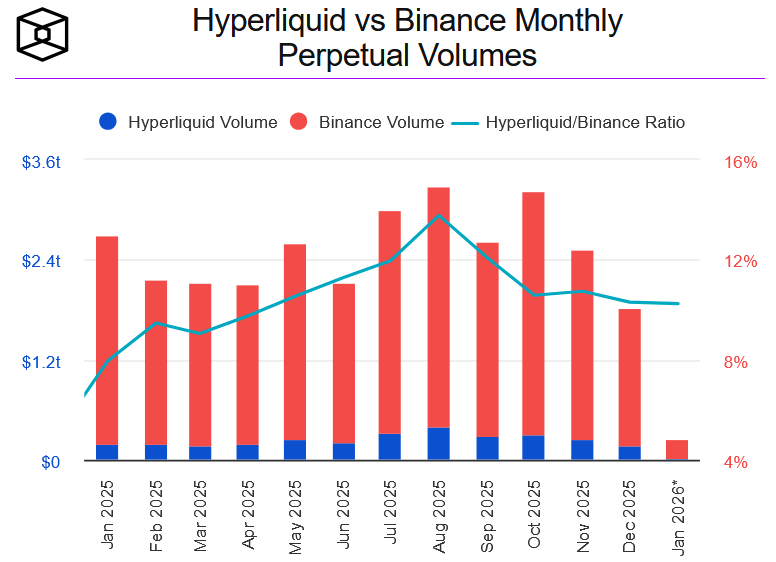 从相对结构看,Perp DEX 与 CEX 合约交易量的比值从年初的 6.34% 攀升至11月峰值的近 20%,而以头部 Hyperliquid 为例,其与Binance 的月度衍生品交易量比值年内由 8% 提升至近 14%。这一系列数据表明,随着基础设施的完善与用户习惯的改变,Perp DEX 已突破流动性瓶颈,正逐步挑战传统现货 DEX,成为承接链上资金的下一代核心流量池。