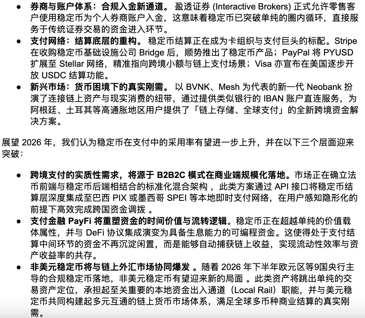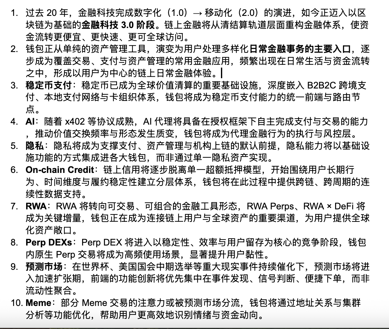 综合上述观察,我们认为 2026 年链上活动将继续从交易驱动走向使用驱动,从依赖阶段性行情与流量,逐步过渡到可复用、可留存的日常金融行为。在这一过程中,钱包将逐步演化为连接用户、链上体系与现实金融世界的核心前端应用。基于这一判断,我们对 2026 年 8 大方向的演进路径作出如下 3 点趋势归纳:
