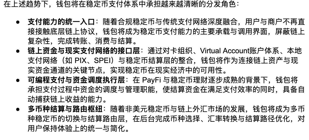 随着稳定币在监管、发行规模和采用率层面的持续突破,其已成为全球价值清算网络的重要组成部分,并开始深度嵌入跨境 B2B2C 支付、本地即时支付系统与卡组织清结算体系;x402等协议的推出让 AI 代理开始具备在既定授权下独立完成支付交易的能力,显著拓展了价值交换的参与主体与频率;这两大变化将共同推动链上价值流动从加密原生场景向现实经济与自动化商业模式外延。通过整合稳定币体系、现实支付网络与多链资产,钱包将为用户提供币种兑换、路径编排与资金调度的功能,逐步演化为连接链上与现实经济的核心结算路由层。