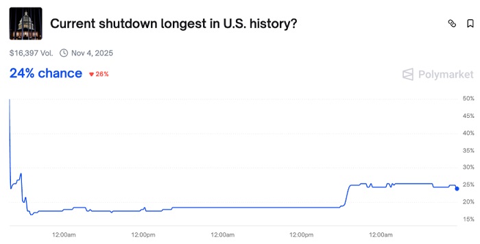 Kalshi 和 Polymarket 等预测市场上的各种数据显示,许多用户预测美国政府关门时间会很长,但不会达到历史最高水平,特朗普在其第一任期内因推动修建美墨边境墙曾创下长达 35 天的美国政府关门纪录。