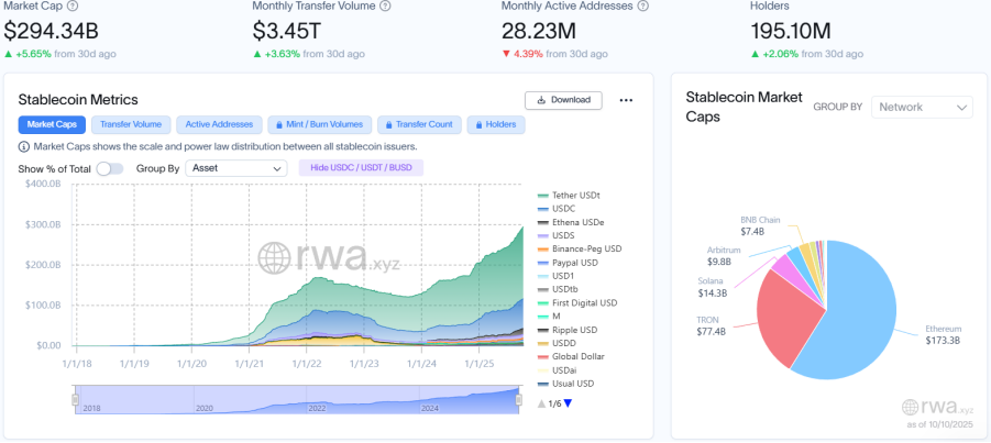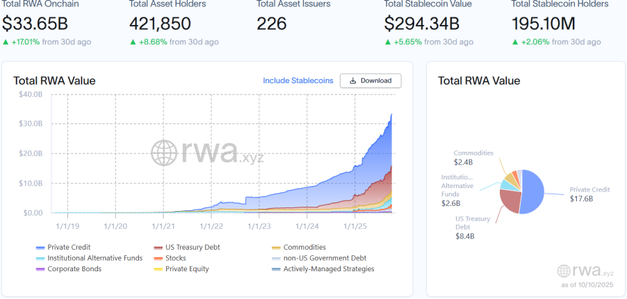 RWA.xyz 最新数据披露,截至2025年10月10日,RWA 链上总市值达336.50亿美元,环比上月同期提高17.01%;资产持有者总数增至42.19万,环比上月同期上涨8.68%;资产发行方总数微增至226家,显示生态参与度持续提升但集中化格局未改。