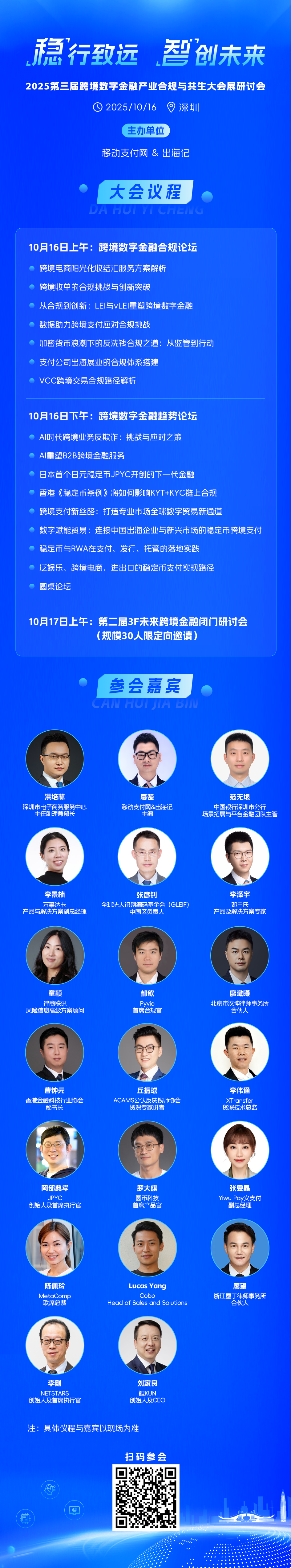 10月16日,由移动支付网、出海记主办的【2025第三届跨境数字金融产业合规与共生大会】将在深圳举办,本届大会将以《“稳”行致远,“智”创未来》为主题,邀请了银行、国际清算机构、海内外支付服务商、支付合规企业、Web3企业等角色,从合规与市场创新发展角度,聚焦跨境金融监管政策解析、风控、稳定币发展及AI应用等热门话题探讨。