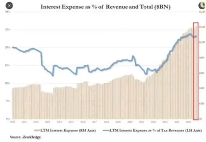 目前美国政府财政收入中近四分之一用于支付国债利息。